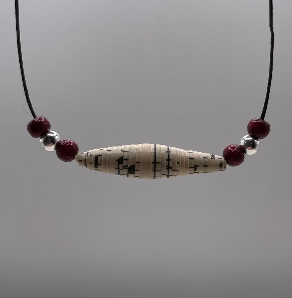 Handcrafted paper bead made using vintage sheet music. Hung with sterling silver and wooden beads on a polyester thread. Finished with sterling silver clasps and extension chain for adaptable hanging length.