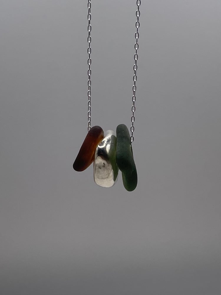 Triple necklace with Green & Brown Sea Glass with a Greek Mykonos Silver Coated Bead